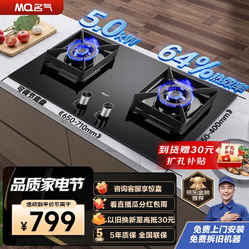 名气(MQ)老板燃气灶天然气嵌入式 家用5.0KW大火力猛火灶 煤气灶双灶 可调节底盘 钢化玻璃灶具 JZT-A6510B价格:799.00元!