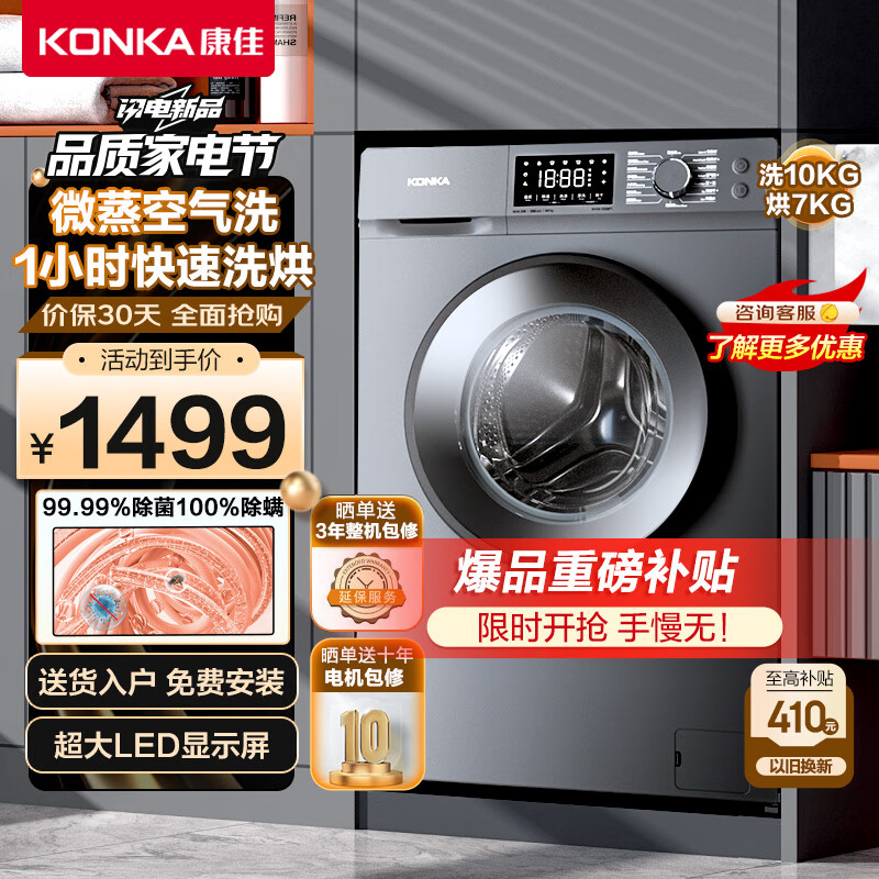 康佳(KONKA)洗衣机10KG超薄全自动滚筒洗衣机 洗烘一体机 内衣洗衣机 上排水 烘干除螨大容量 KH100-1202BPT价格:1499.00元!
