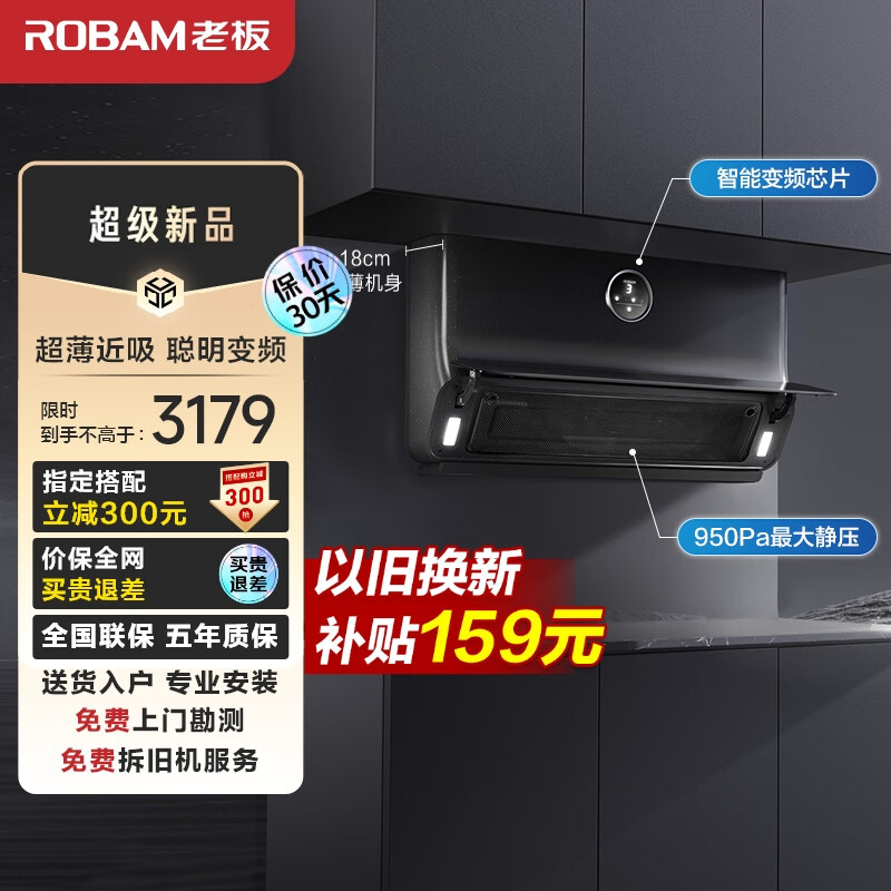 老板(Robam)抽油烟机超薄近吸变频23风量80cm小尺寸油烟机家用大吸力智能换气以旧换新吸脱排油烟机22D2S灰色价格:3179.00元!