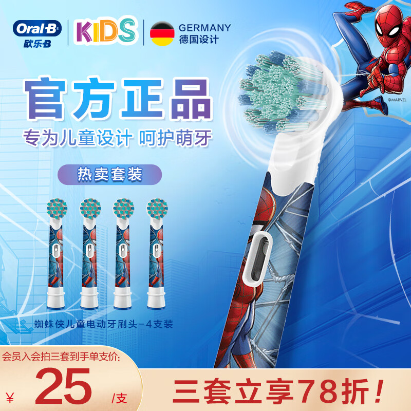 欧乐B儿童电动牙刷头4支装适用D103KD100KPro1kids蜘蛛侠EB10/EB10S-4K德国进口软毛(图案包装随机发)价格:129.00元!