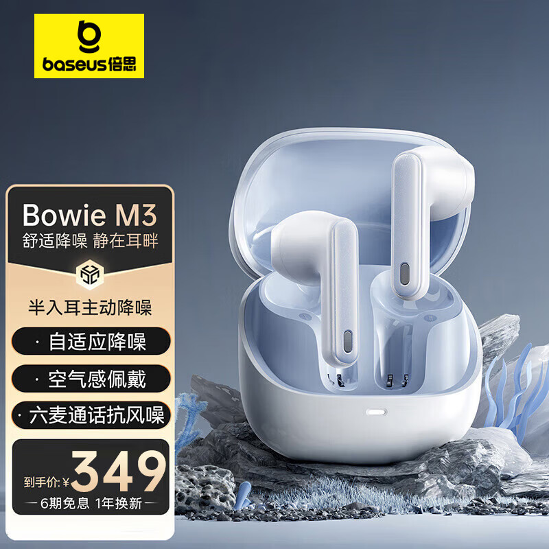倍思M3 真无线蓝牙耳机 主动降噪耳机 半入耳舒适降噪 30h长续航蓝牙5.3适用苹果小米华为手机 白价格:399.00元!