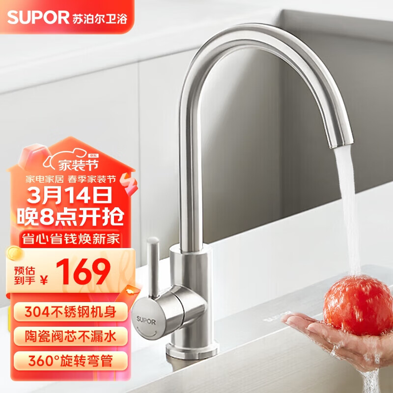 苏泊尔(SUPOR)水龙头厨房冷热304不锈钢洗菜盆洗手面盆水槽龙头360度可旋转价格:179.00元!