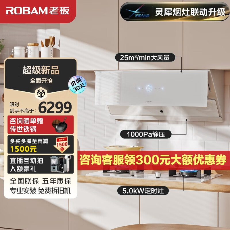 老板(Robam)【灵犀烟灶联动升级】抽油烟机变频家用25风量侧吸烟机燃气灶烟灶套装白色29X8SW+37B8XW(天然气)价格:6298.00元!