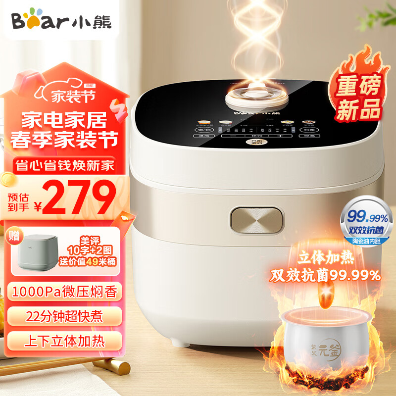 小熊(Bear)电饭煲 电饭锅家用 4升大容量3-8人柴火饭多功能智能微压22分钟快煮陶瓷油内胆米饭锅 DFB-D40N1价格:278.00元!