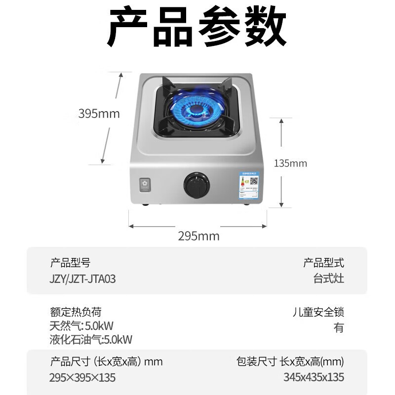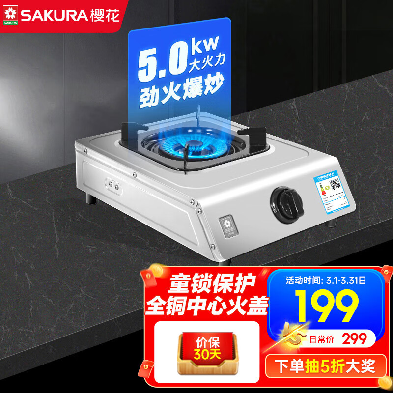樱花(SAKURA)燃气灶不锈钢材质台上灶二级能效节能家用大火力灶具5.0KW猛火台式单眼灶液化气灶煤气灶 JTA03【天然气】5.0kw价格:199.00元!