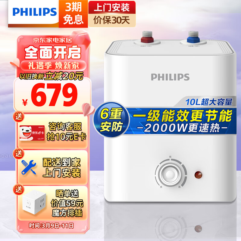飞利浦(PHILIPS)一级能效10升上出水电热水器迷你小厨宝 小尺寸2000W速热 实时控温AWH1004/93(100UA)价格:679.00元!