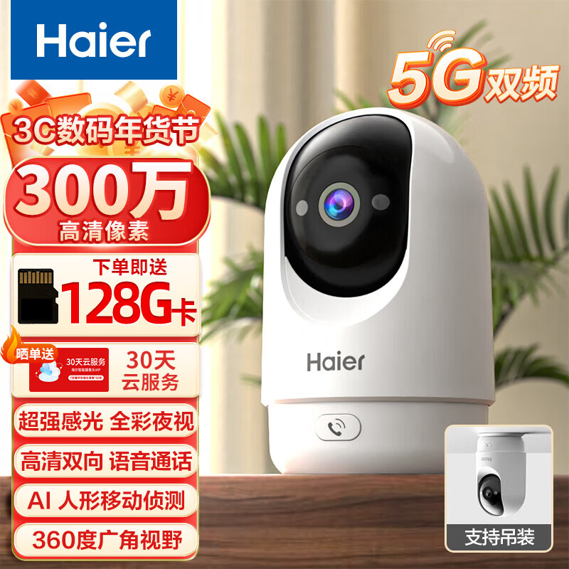 海尔(Haier)手机远程监控日夜全彩双向语音通话超清智能家用摄像头HCC-25B343-U1+128g卡价格:159.00元!