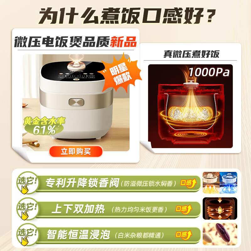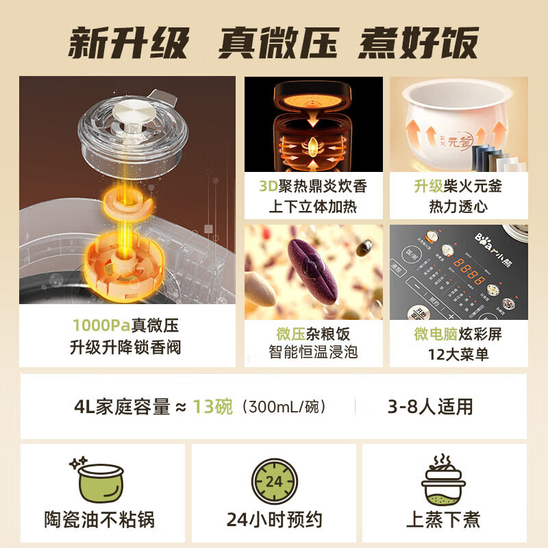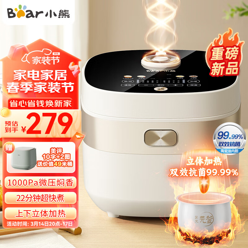 小熊(Bear)电饭煲 电饭锅家用 4升大容量3-8人柴火饭多功能智能微压22分钟快煮陶瓷油内胆米饭锅 DFB-D40N1价格:278.00元!