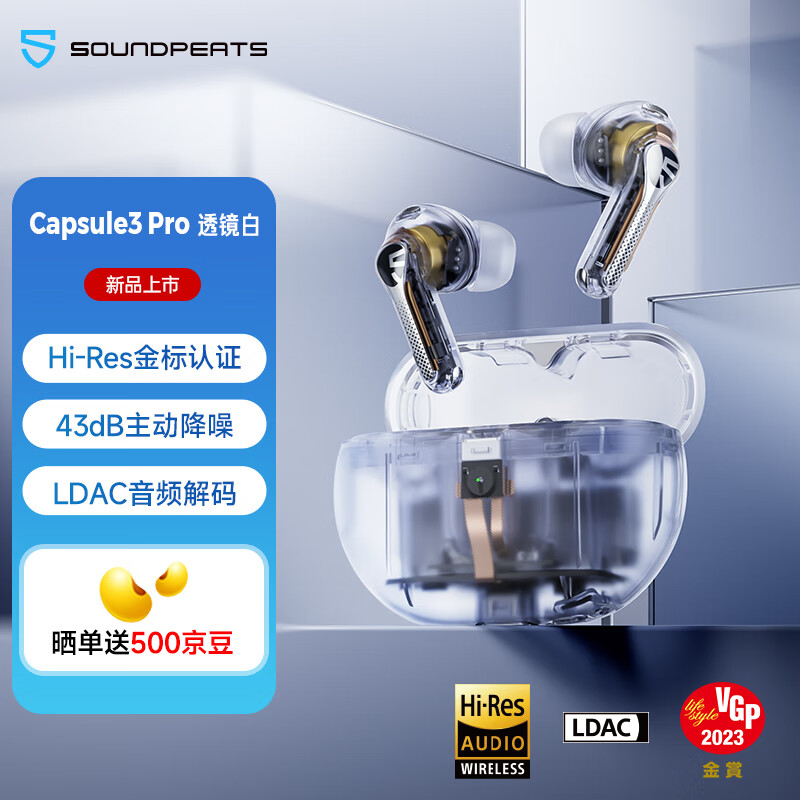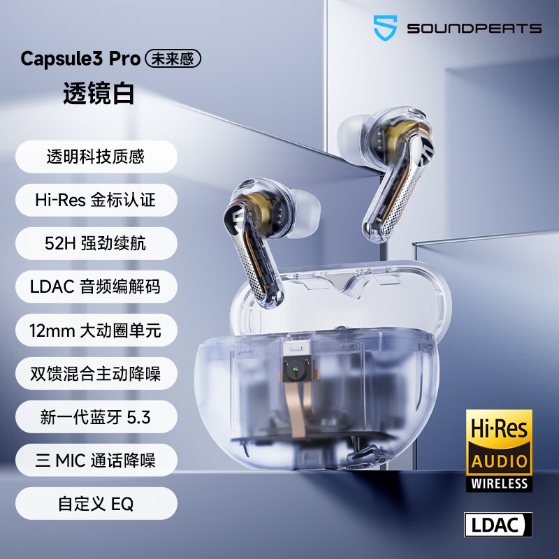 泥炭(SoundPEATS)Capsule3 Pro 未来感 真无线蓝牙耳机 Hi-Res 泥炭蓝牙耳机透明版 入耳式主动降噪蓝牙5.3 透镜白价格:299.00元!
