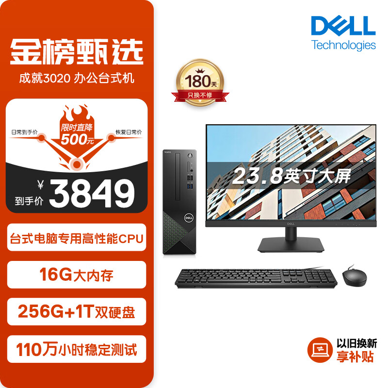 戴尔(DELL)成就3020 台式电脑主机(酷睿13代i5-13400 16G 256GSSD+1TB)23.8英寸大屏显示器 高性能CPU台式机价格:3849.00元!
