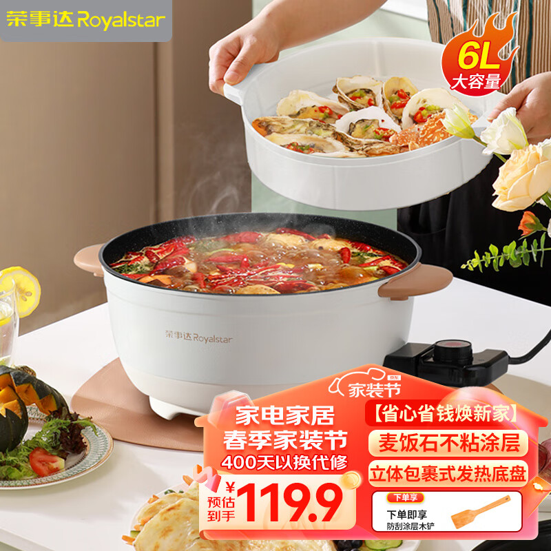 荣事达(Royalstar)电火锅 电炒锅 电煮锅 电锅一体 电热锅多功能多用途锅家用烤肉涮火锅锅具6L火锅DRG-150A配蒸笼价格:119.90元!