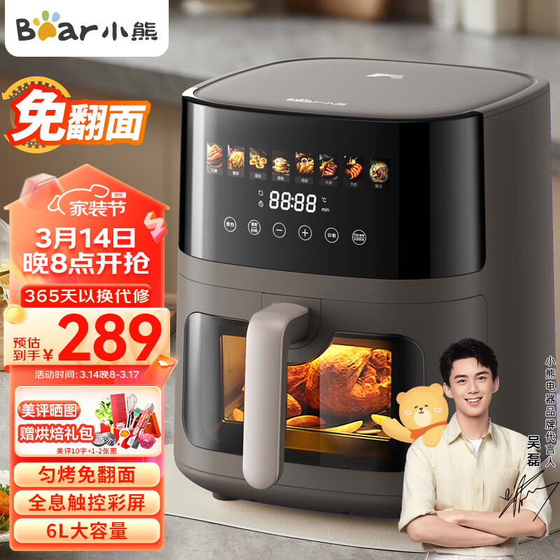 小熊(Bear)空气炸锅6升烤炸一体可视大容量全自动不用翻面家用排行榜多功能低脂微蒸汽嫩烤彩图智控QZG-P16J6价格:289.00元!