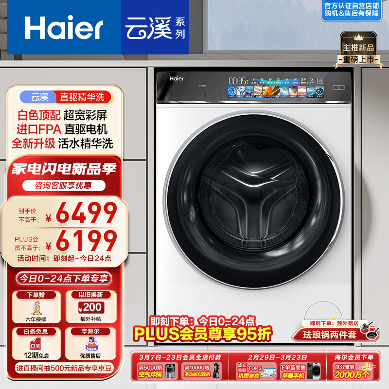 海尔(Haier)滚筒洗衣机全自动 活水精华洗2.0 云溪白376Pro 直驱超薄平嵌 超宽彩屏 EG10014HBDL9W价格:6499.00元!