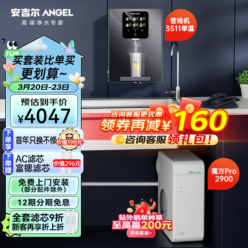 安吉尔净水器家用过滤器套装【魔方pro2900+管线机3511】5年RO反渗透厨下式直饮机1100G体验价格:4047.00元!