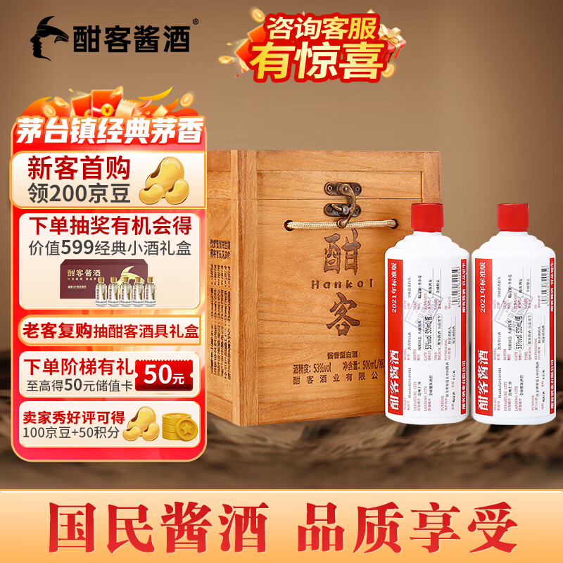 酣客 2021年标准版 酱香型白酒 53度坤沙大曲 500ml*2瓶 木箱礼盒装价格:942.00元!