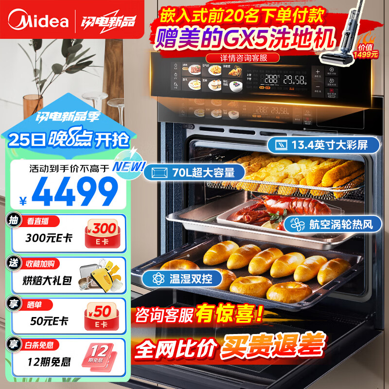 美的70L大容量嵌入式蒸烤箱一体机 航空涡轮热风 温湿双控 13.4英寸大彩屏 蒸烤炸炖4合1体SX7价格:4699.00元!