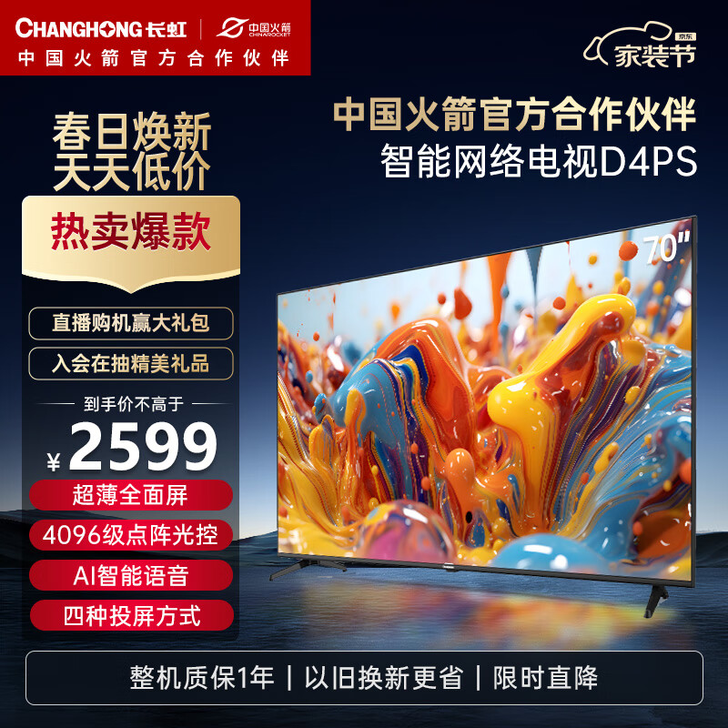 长虹电视70D4PS 70英寸超薄无边屏 2+16GB 智能语音4K超高清手机投屏 LED平板液晶电视机 以旧换新价格:2599.00元!