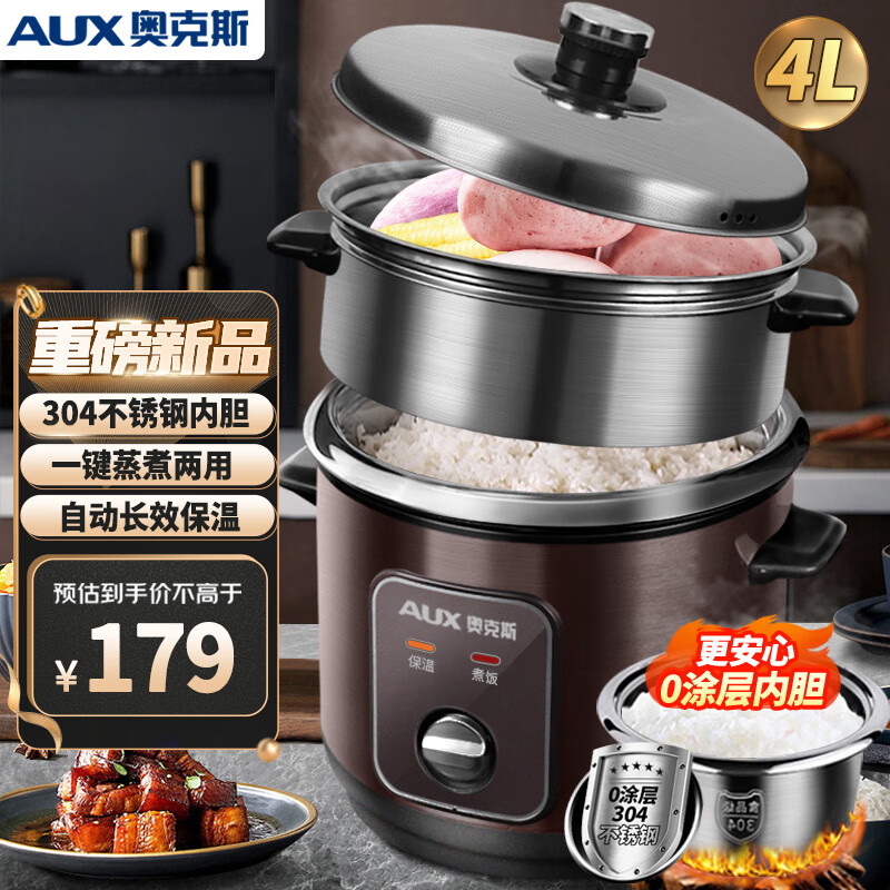 奥克斯(AUX)电饭煲4L电饭锅 直身式带蒸笼 操作简单 304不锈钢内胆家用小电饭锅VK-402Z6价格:179.00元!