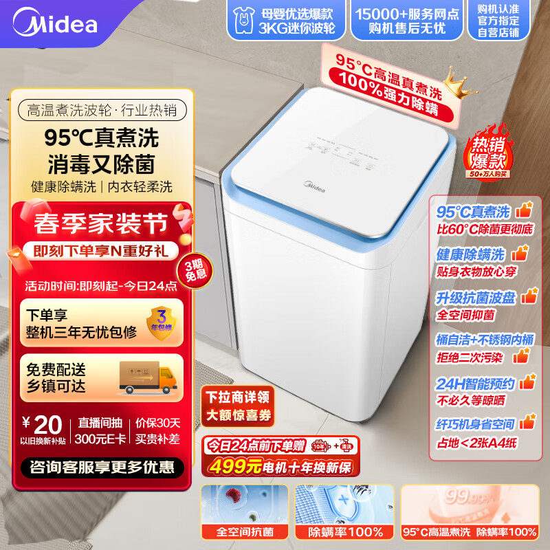 美的(Midea)波轮洗衣机全自动MB30VH10E PRO 3公斤婴儿洗衣机迷你洗衣机小型儿童洗衣机内衣洗衣机高温煮洗价格:739.00元!