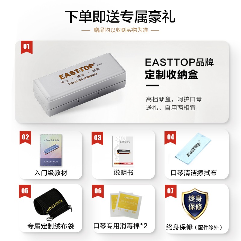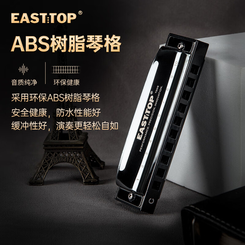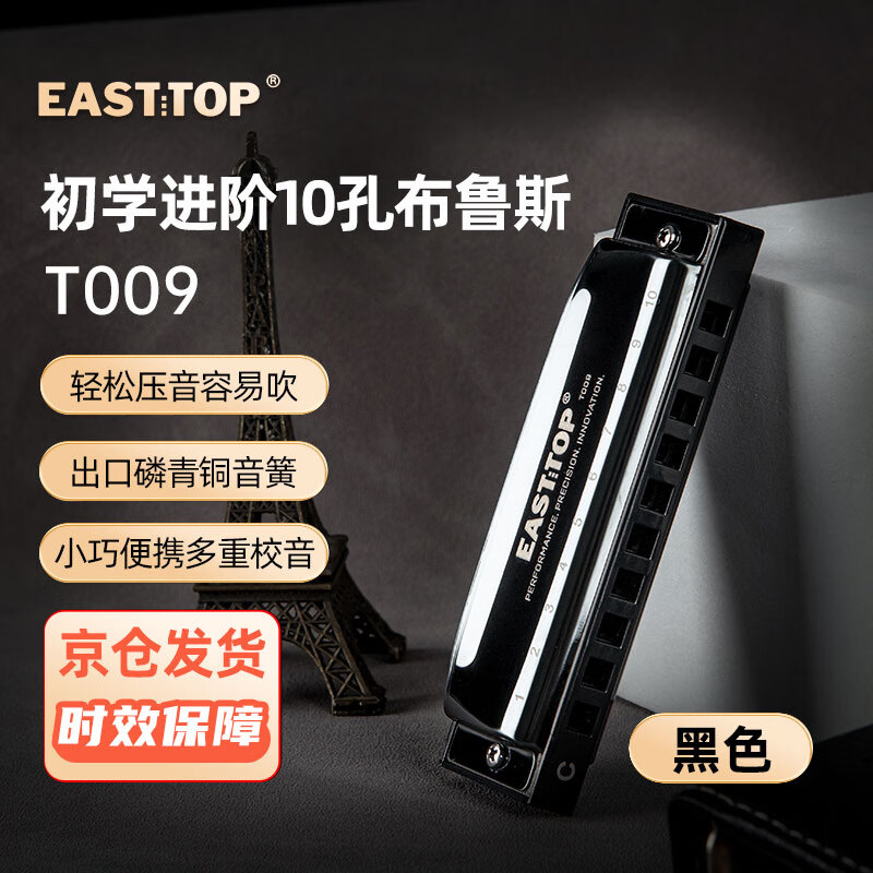 东方鼎(EAST TOP)布鲁斯口琴10孔嵌入式亮黑色盖板灰色塑盒T009 初学推荐价格:109.00元!