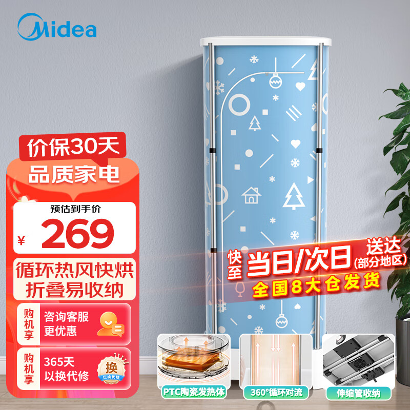 美的(Midea)干衣机烘干机家用 衣服烘干机定时布罩式小型 便携可折叠婴儿衣物暖风烘衣机衣柜护理机MGJ90-01W价格:269.00元!