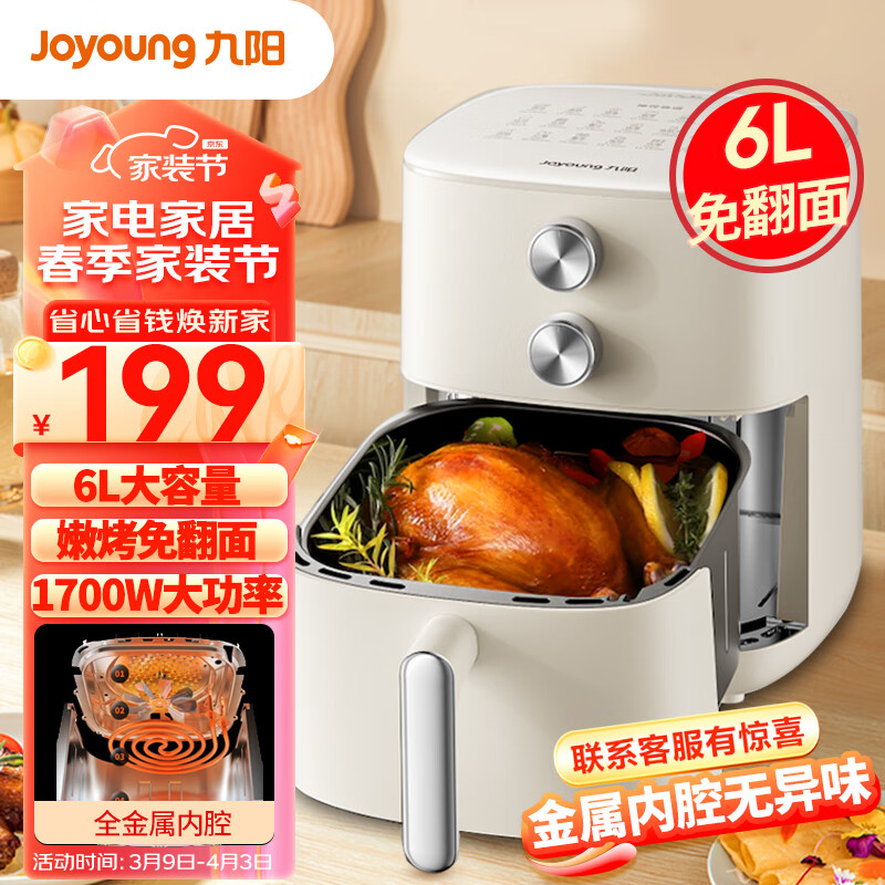 九阳(Joyoung)不用翻面 6L 大容量 空气炸锅 蒸汽嫩炸 炸烤箱一体 精准控温 1700W大功率 不沾易洁 KL60-V575价格:199.00元!