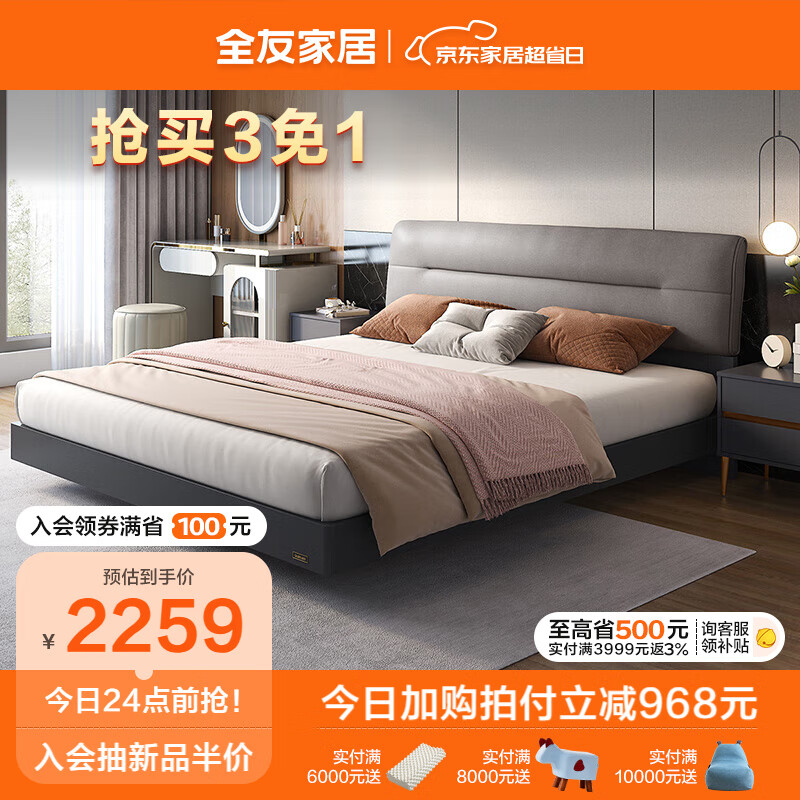 全友家居 轻奢床双人床1.5米主卧大床科技布软床卧室悬浮床家具126805价格:3227.14元!