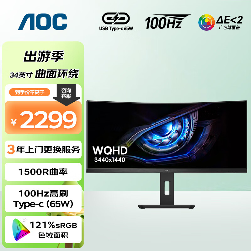 AOC34英寸 WQHD 1500R曲面带鱼屏21:9 Type-C 65W反向充电 100hz办公游戏设计剪辑显示器 CU34P2C价格:2299.00元!