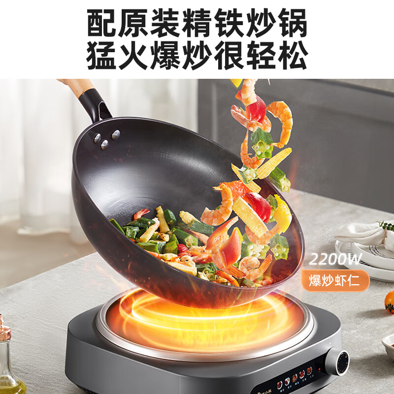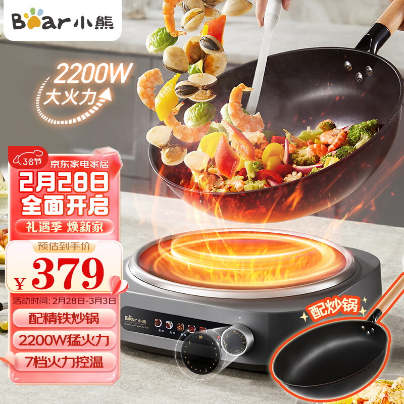 小熊(Bear)电磁炉家用大功率2200W火锅炉电磁灶智能定时电灶防水黑色微晶面板 B22F5 配炒锅价格:369.00元!