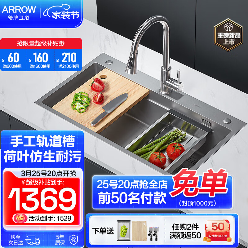 箭牌(ARROW)304不锈钢水槽纳米轨道大单槽厨房洗菜盆洗菜池洗碗一体盆 78钛灰纳米轨道槽-含抽拉龙头价格:1699.00元!