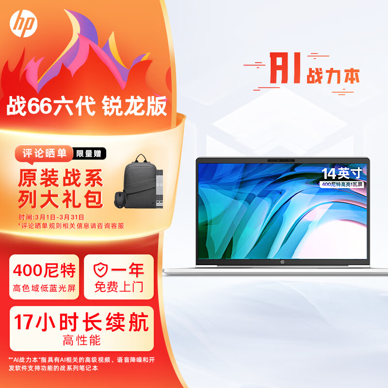 惠普(HP)战66六代 锐龙版14英寸轻薄笔记本电脑(锐龙高性能R7 16G 512G 长续航 高色域低蓝光 AI新体验)价格:3999.00元!
