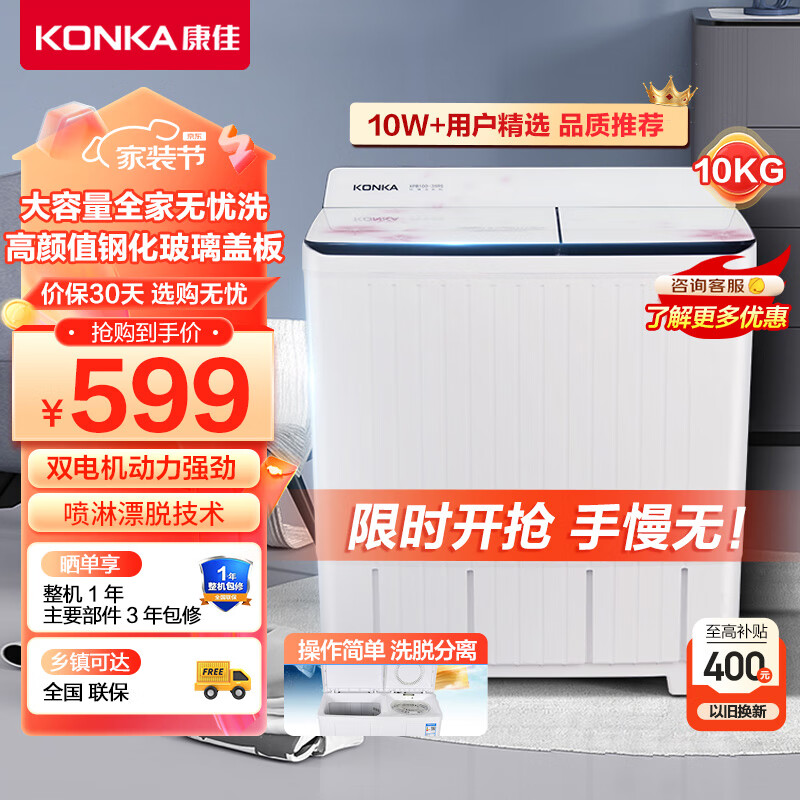 康佳(KONKA)10公斤 半自动波轮洗衣机 大容量 双桶双缸 脱水甩干机 家电 XPB100-359S价格:599.00元!