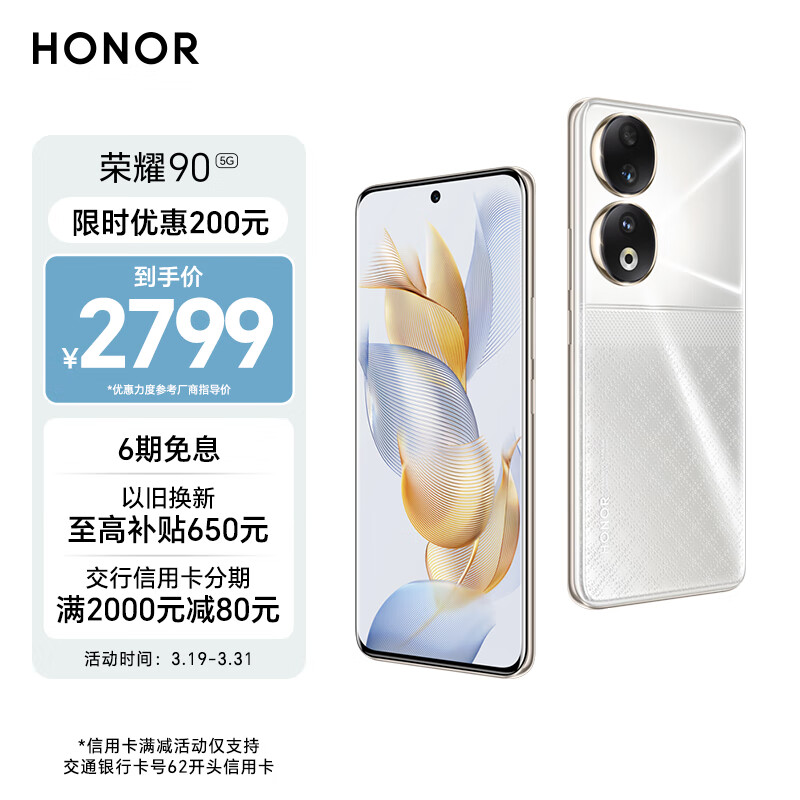 荣耀90 2亿像素超清相机 调光护眼屏 5000mAh轻薄长续航 16GB+512GB 星钻银 5G价格:2799.00元!