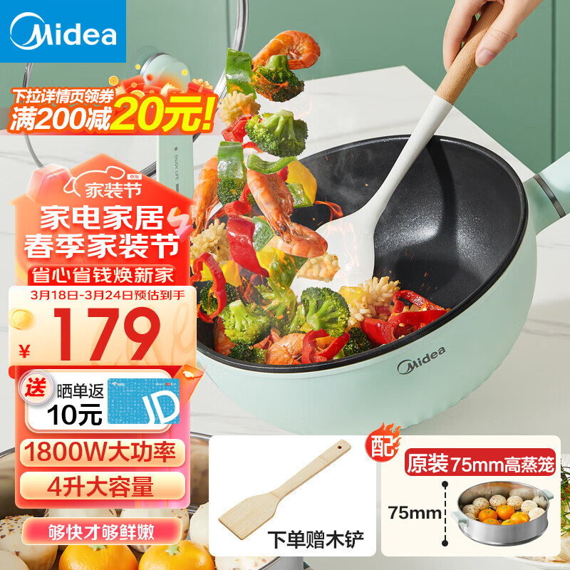 美的(Midea)电炒锅 电火锅 电蒸锅 电煮锅家用多功能多用途大功率一体锅 炒菜锅4L大容量电热锅 配蒸笼 MC-HGE2815 4L价格:239.00元!