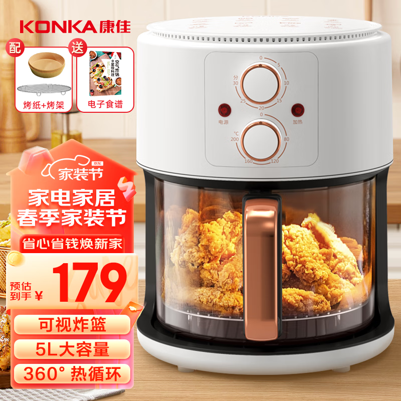 康佳(KONKA)空气炸锅 烤肉锅 家用多功能 智能玻璃内胆可视 低脂 无油煎炸空烤5L大容量 KKZG-5006-W价格:179.00元!