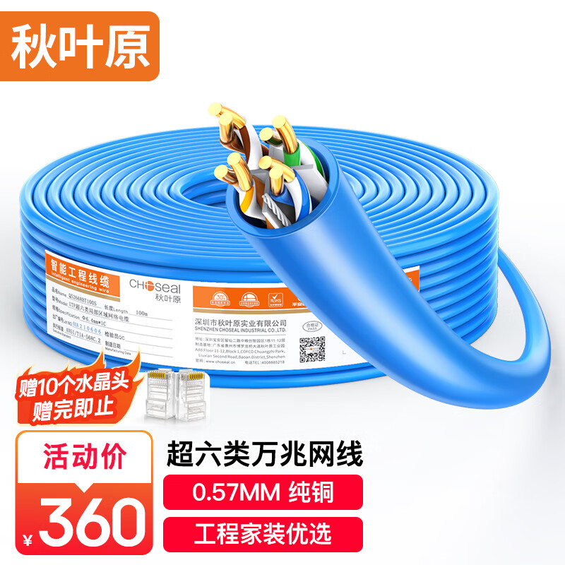 秋叶原(CHOSEAL)原装超六类非屏蔽网线 CAT6A类万兆高速 纯铜线芯 工程家装网络箱线 蓝色100米 QS2668BT100S价格:379.00元!