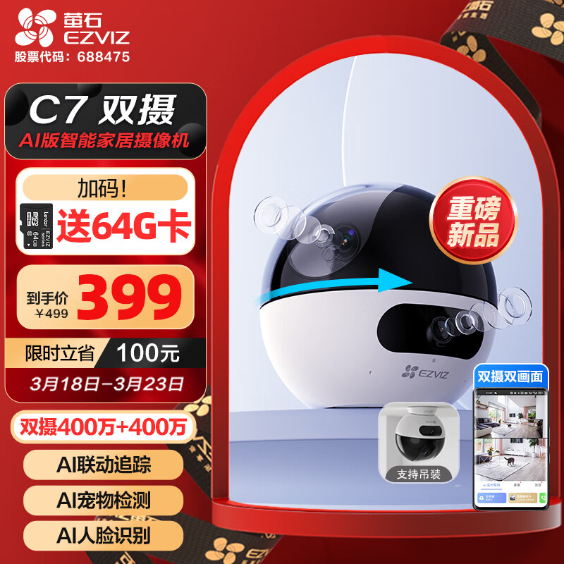 萤石C7 800万双摄监控摄像头 360度无死角带夜视全景无线家庭室内 手机远程 自动巡航 婴儿看护价格:399.00元!