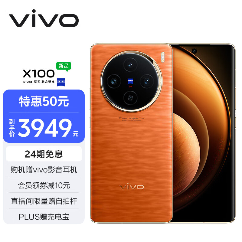 vivo X100 12GB+256GB 落日橙 蓝晶×天玑9300 5000mAh蓝海电池 蔡司超级长焦 120W双芯闪充 拍照 手机价格:3999.00元!