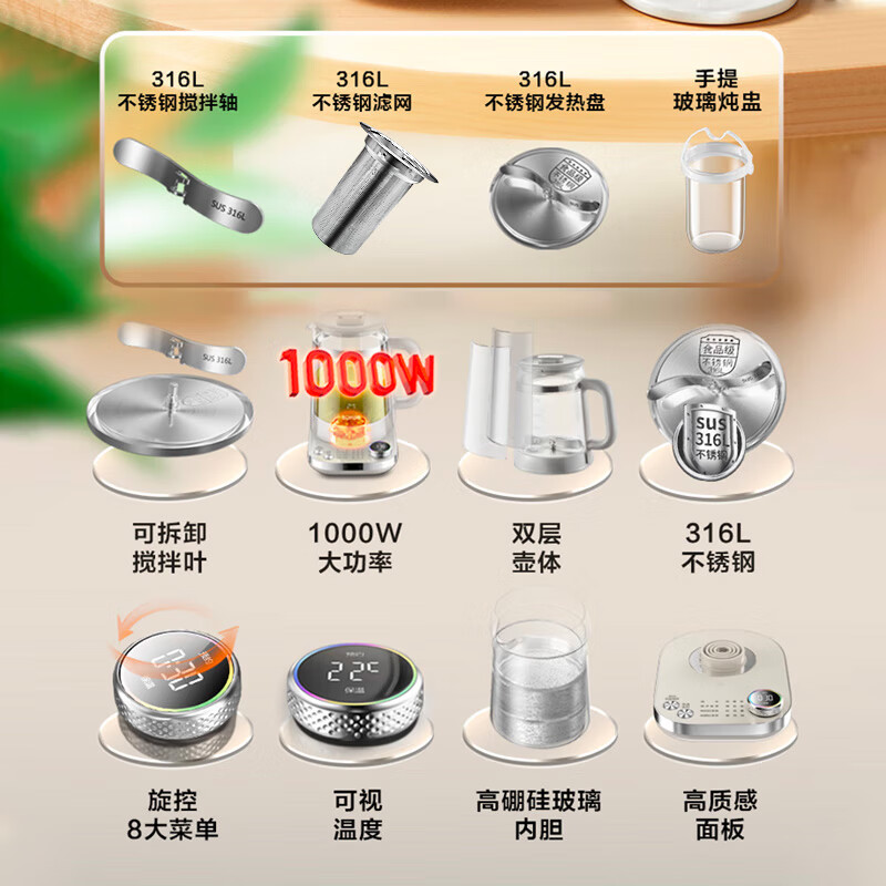 内置配件:不锈钢滤网,玻璃炖盅