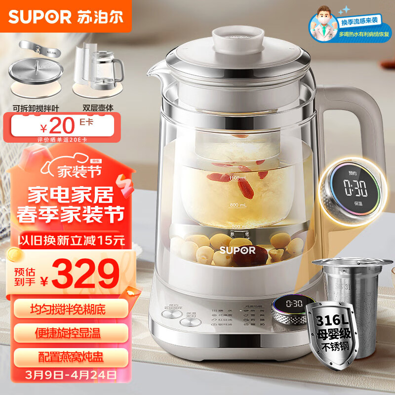苏泊尔(SUPOR)养生壶 1.5L煮茶器花茶壶 玻璃电水壶 双层防烫 燕窝炖盅316L不锈钢搅拌熬煮 SW-15YT03D价格:329.00元!