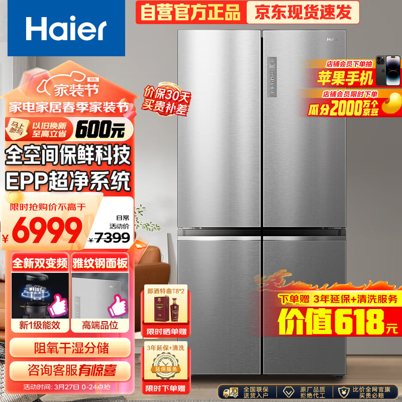 海尔(Haier)657升全空间保鲜十字双开四开门家用电冰箱一级能效变频无霜大容量以旧换新BCD-657WGHTD19S7U1价格:6999.00元!