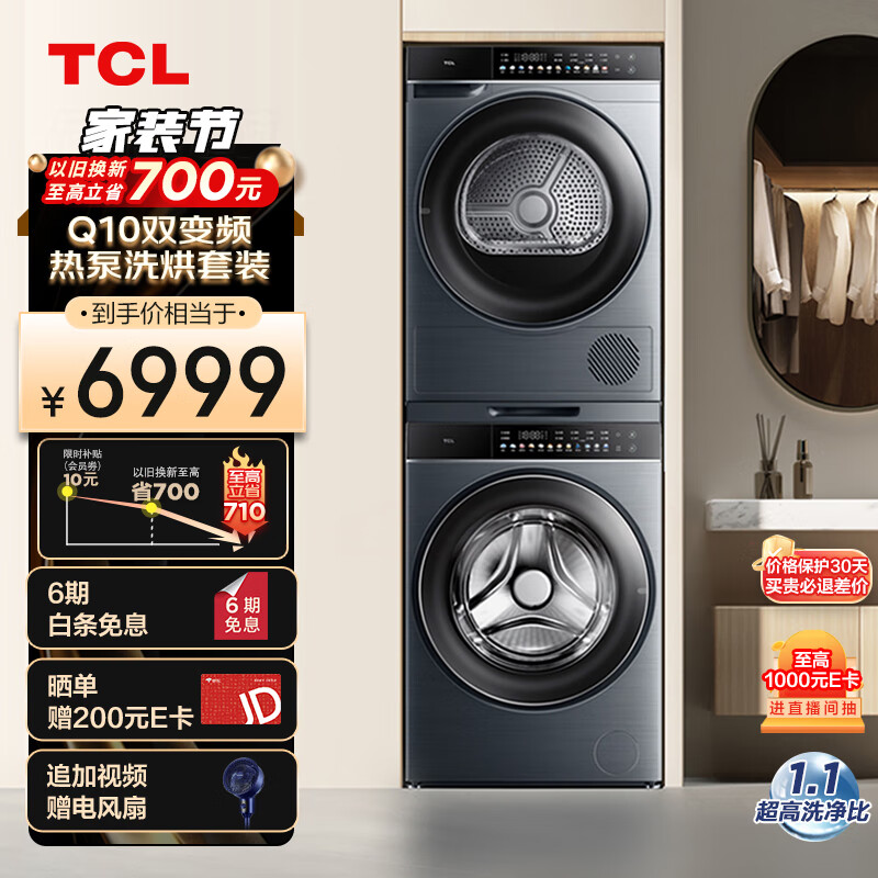 TCL 10KG双变频热泵洗烘套装Q10 柔烘护理 全自动滚筒洗衣机 智能投放 G100Q10-DI+H100Q10价格:8999.00元!
