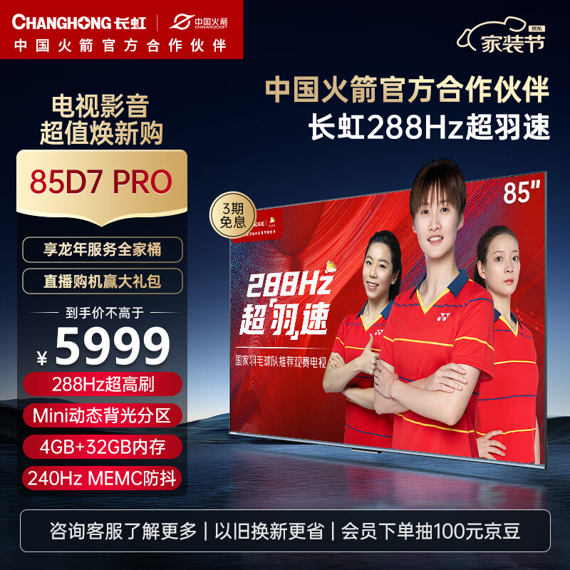 长虹电视85D7 PRO 85英寸288Hz游戏电视 Mini动态背光 高色域 MEMC 4K智能平板液晶LED电视机以旧换新价格:5998.00元!