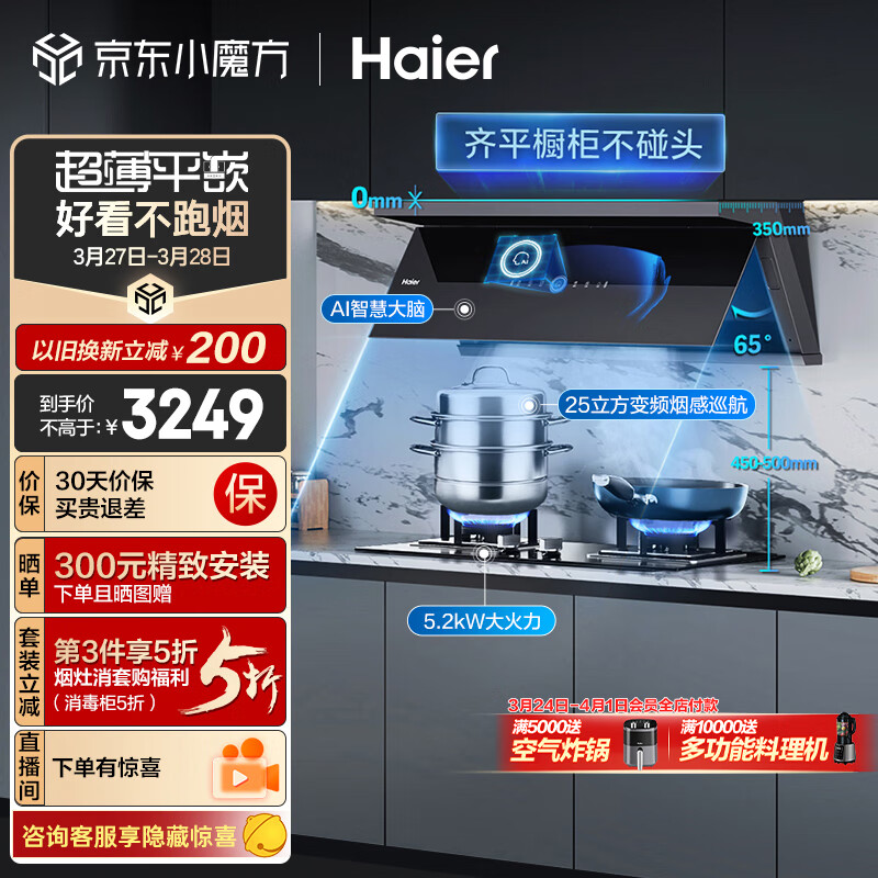 海尔(Haier)抽油烟机 超薄近吸烟灶套装 25m3/min变频有效风顶侧双吸外观 厨房吸油烟机燃气灶具C21U1+Q2BE3天价格:3249.00元!