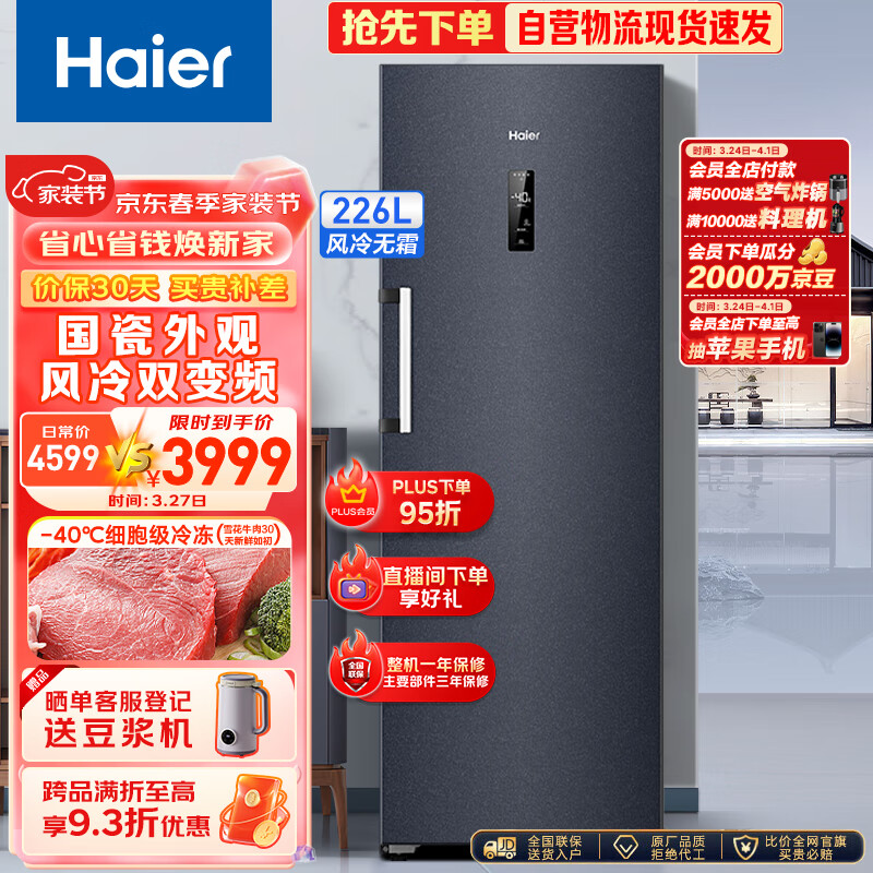 海尔(Haier)国瓷系列 226升 -40℃风冷变频家用立式冰柜 冷藏冷冻柜抽屉式冷柜小冰柜家用小型冰箱BD-226WGHEC价格:4199.00元!