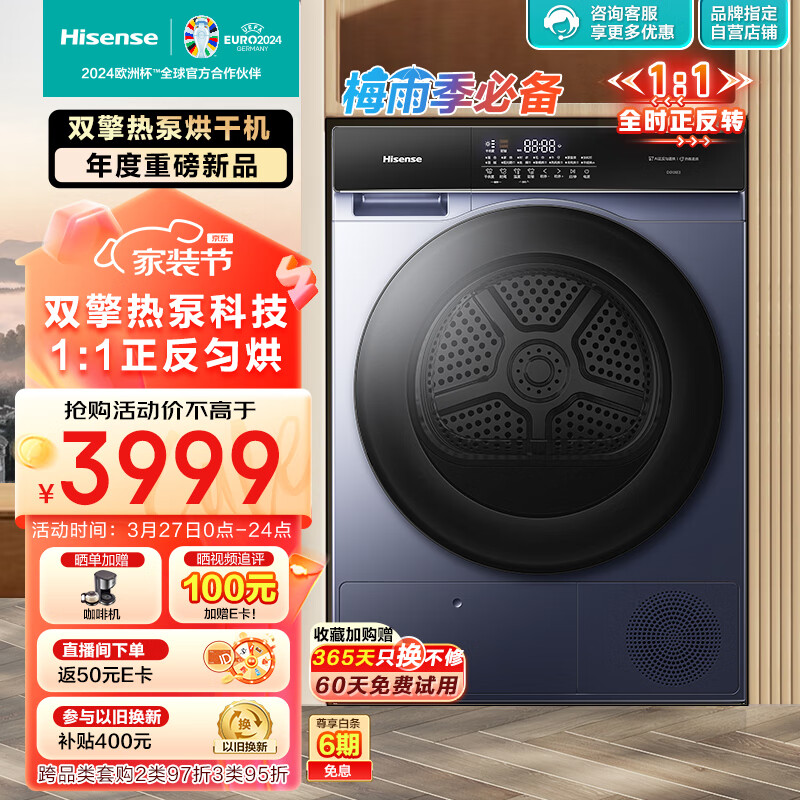海信(Hisense)SE烘干机家用 10公斤双擎热泵干衣机 1:1正反转 羊绒烘 梅雨季必备 大风量柔烘 DG10SE3以旧换新价格:3999.00元!