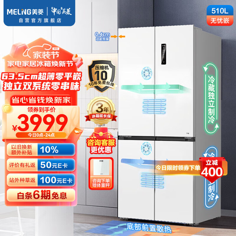 美菱(MeiLing)无忧嵌510升十字对开四开门冰箱家用无霜变频一级能效BCD-510WP9CZX白大容量双系统双循环超薄嵌入价格:4399.00元!