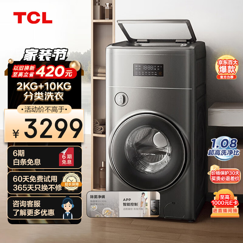 TCL 12KG双子舱·复式分区洗衣机T300 母婴分类洗 除菌除螨 APP智控 双筒全自动滚筒洗衣 G120T300-BYW价格:3299.00元!