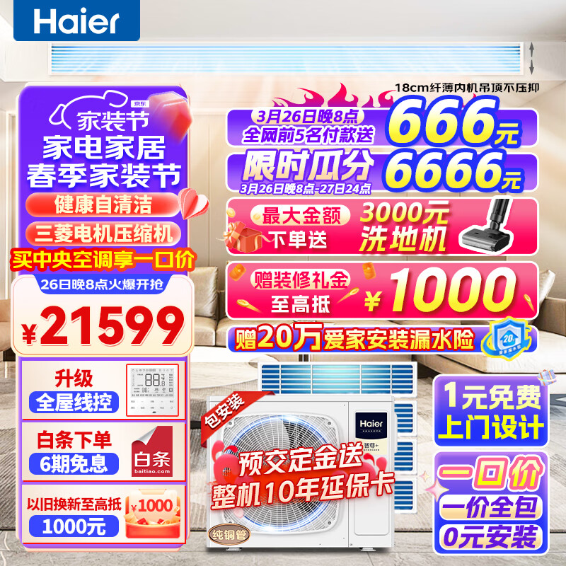 海尔(Haier)中央空调一拖四风管机4匹小多联一级能效全直流变频嵌入式智尊+ RFC100MXSAVA(G)价格:21599.00元!