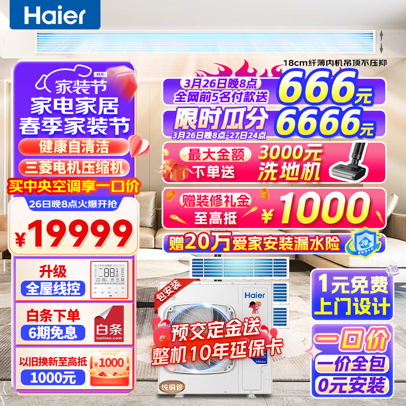 海尔(Haier)中央空调一拖三风管机5匹小多联一级能效全直流变频嵌入式智尊+ RFC125MXSAVB(F)价格:19999.00元!